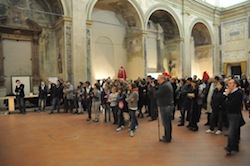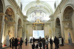 La location, come da aspettative, si è rivelata davvero suggestiva: stiamo parlando dell’ex chiesa di S.Mattia di Bologna, luogo religioso sconsacrato che da qualche tempo ospita eventi di questo tipo. Un piccolo gioiello intessuto di storia, nel centro storico della città, che ha permesso alle grandi opere dell’artista (molte di alcuni metri d’altezza!) di avere lo spazio adeguato per essere osservate dai partecipanti all’evento.