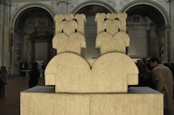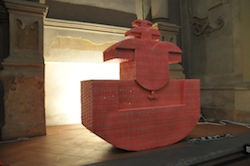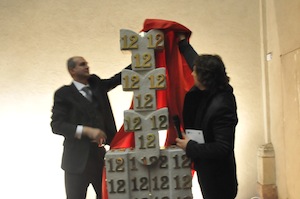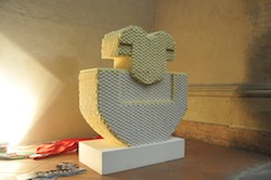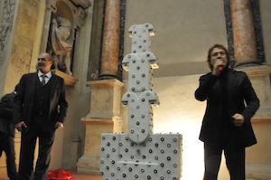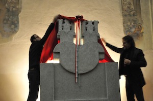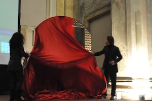 A una prima introduzione sul progetto da parte dell’artista Michele D’Aniello che, come vi avevamo spiegato, ha cercato attraverso le sue opere di suggellare il rapporto tra arte e industria, è seguita la presentazione di ogni singolo manufatto. Di volta in volta, assieme ai rappresentanti delle aziende bolognesi che hanno aderito all’iniziativa, D’Aniello ha “svelato” al pubblico il risultato del suo lavoro: monumenti e sculture realizzate con i materiali forniti dalle aziende stesse. Via i lunghi mantelli rossi, ecco che le opere si sono materializzate davanti agli spettatori presenti…